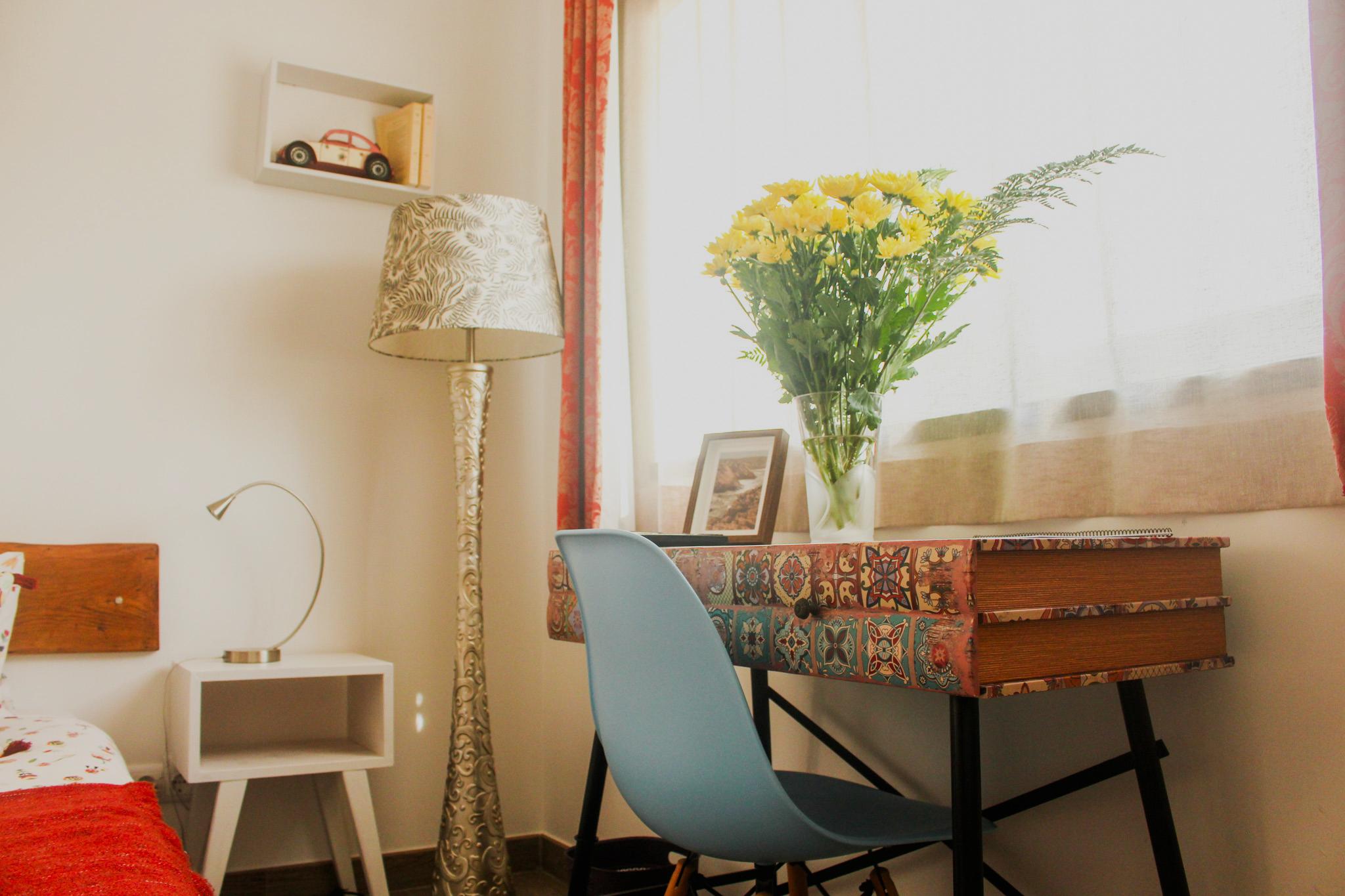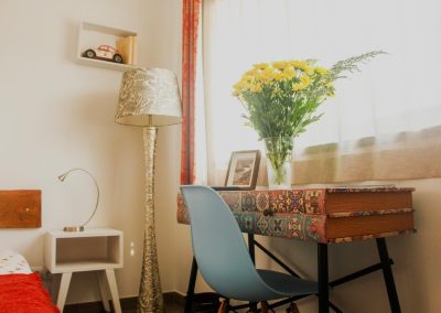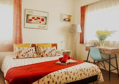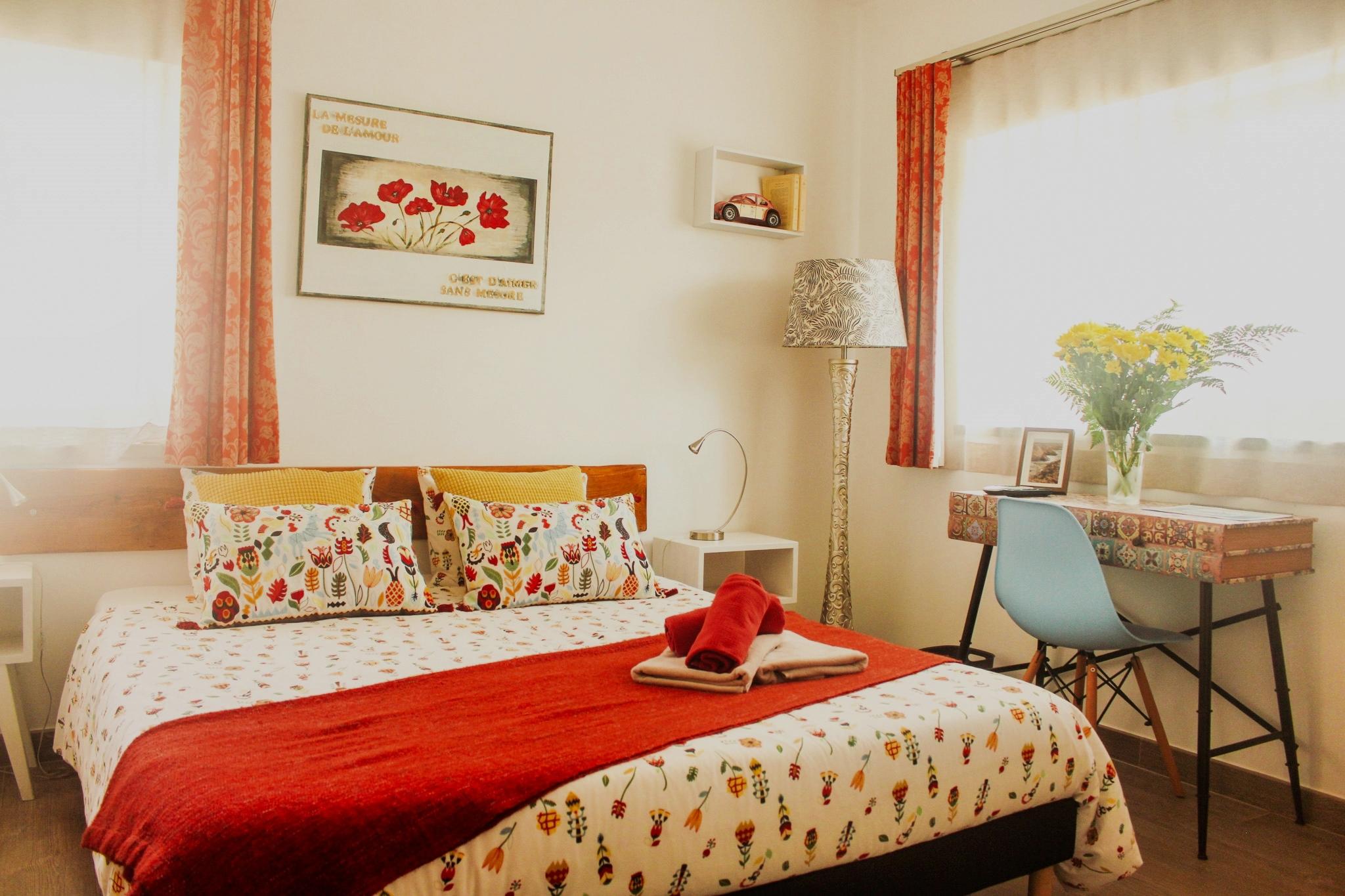 Very typical room in the setting sun tones offers a large double bed of 160 × 200 cm, a private bathroom and the view of the pool.