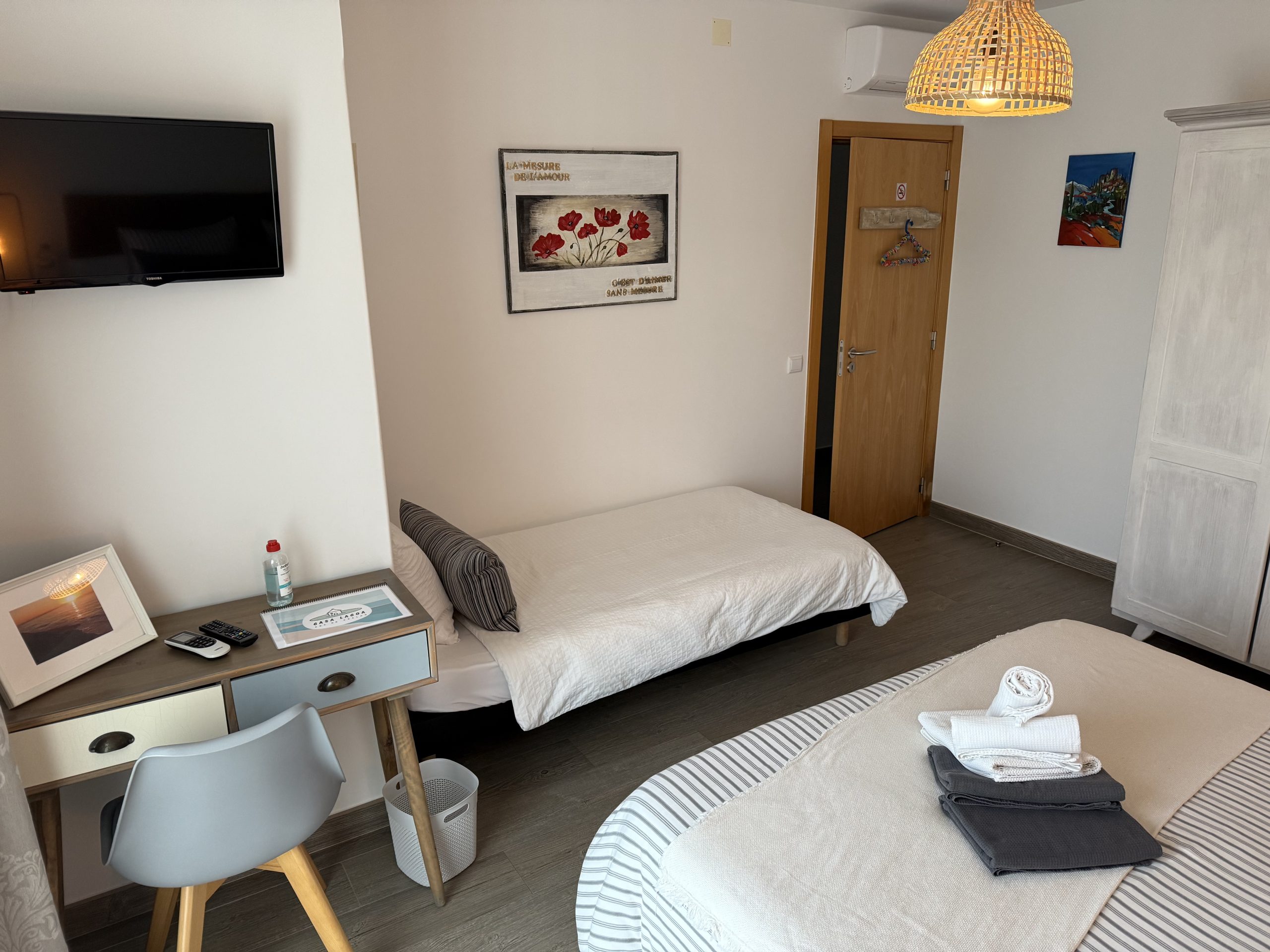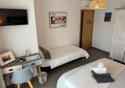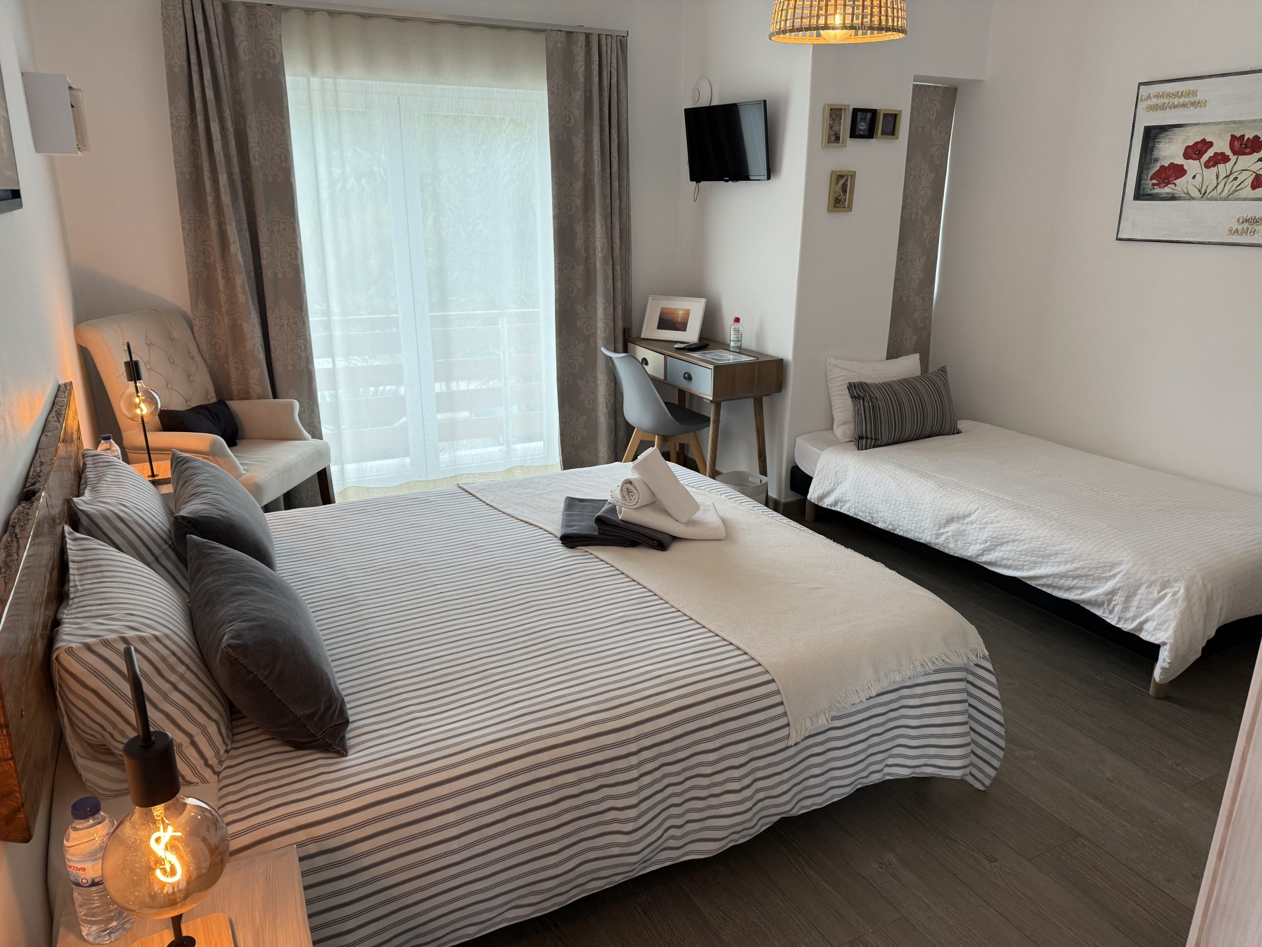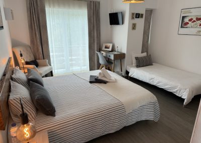 Grande quarto de 16 metros quadrados com uma bela casa de banho, é ideal para 3 pessoas, há uma grande cama de casal de 160 × 200 cm e uma cama de solteiro de 90 × 200 cm. Tem 2 varandas e um terraço com vista para a rua.